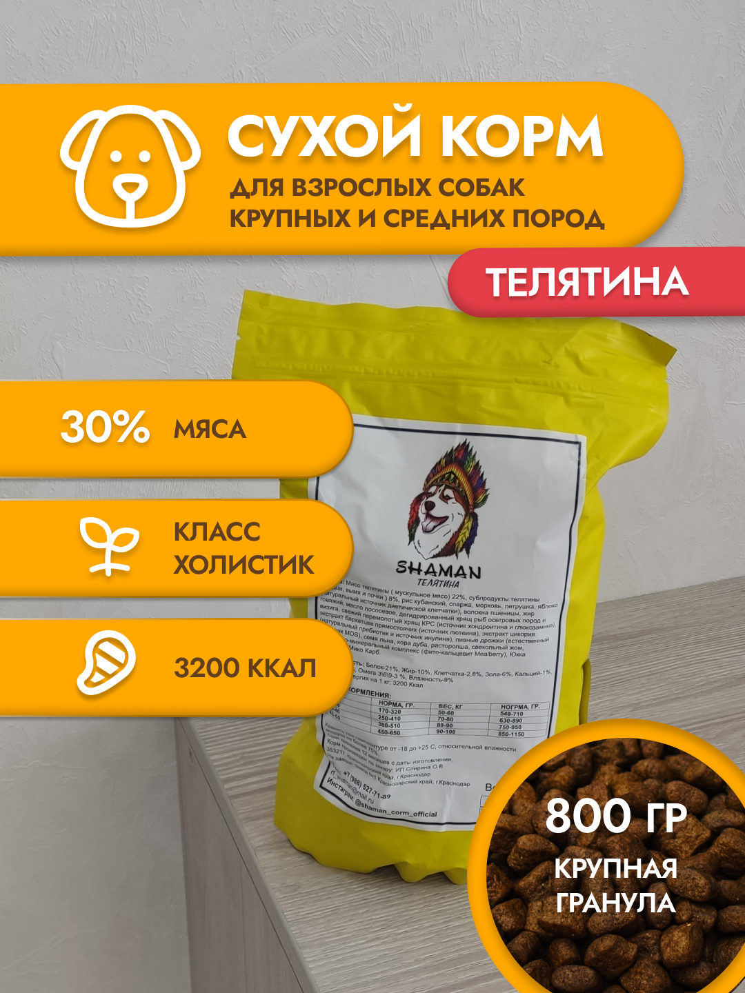 Сухой корм для собак Shaman класса Holistic, производится только из натуральных ингредиентов, БЕЗ гмо и усилителей вкуса, на современном высокотехнологичном оборудовании в Городе Краснодар. Товар сертифицирован. Корм идеально сбалансирован и подходит для кормления собак разных пород. Он прекрасно подойдет средним и крупным породам собак, таким как: Тибетский мастиф, алабай, овчарка, Маламут и т.д. Корм отечественного производства, упакован в плотный, герметичный целлофановый пакет.