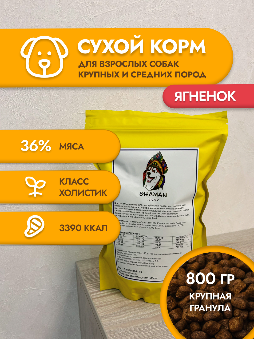 Сухой корм для собак "Shaman" Ягненок 800 г; крупные гранулы; Класс Холистик