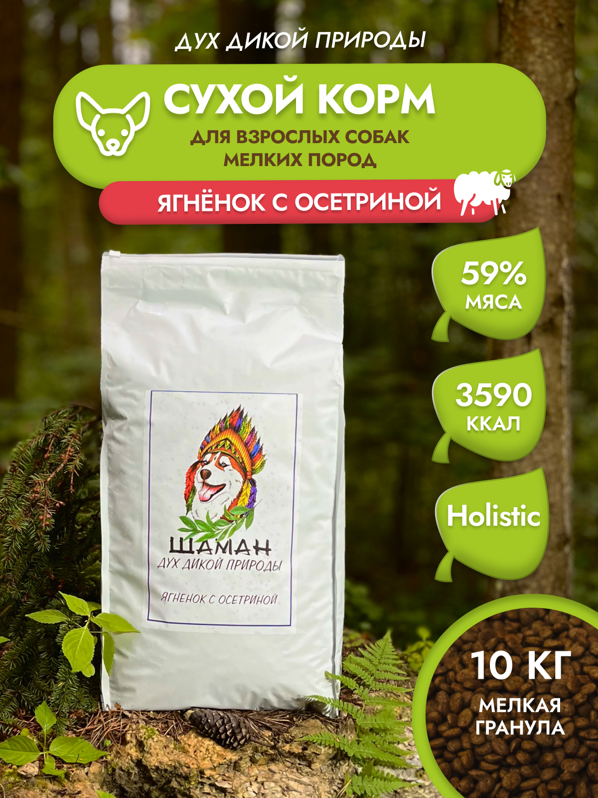 Сухой корм SHAMAN "Дух дикой природы" Ягненок с осетриной 10 кг; мелкая гранула; для взрослых собак; Класс Холистик